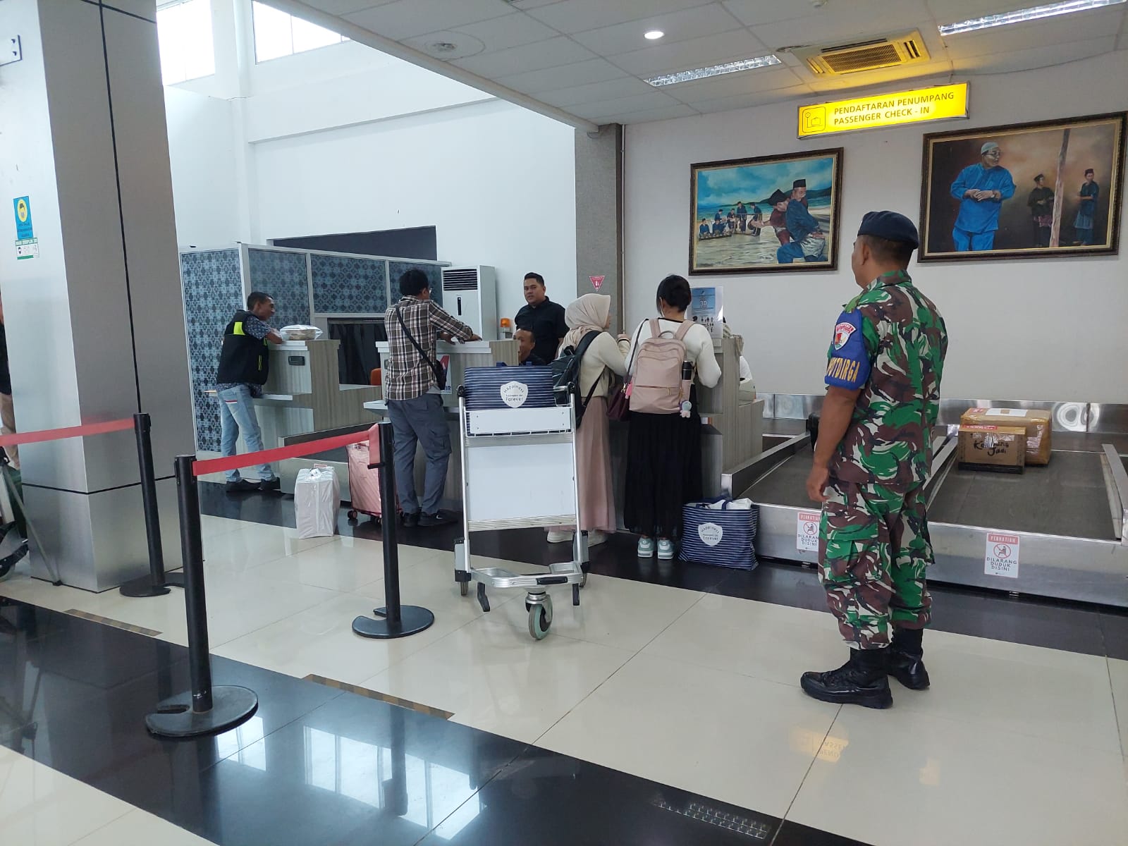 Natuna| Mandhala.info-Personel Lanud Raden Sadjad (RSA) melaksanakan pengamanan di Bandara Raden Sadjad, Ranai, Kabupaten Natuna, Provinsi Kepulauan Riau, guna memastikan kelancaran arus mudik menjelang Hari Raya Idul Fitri 1446 H/2025 M, Sabtu(29/3/2025).