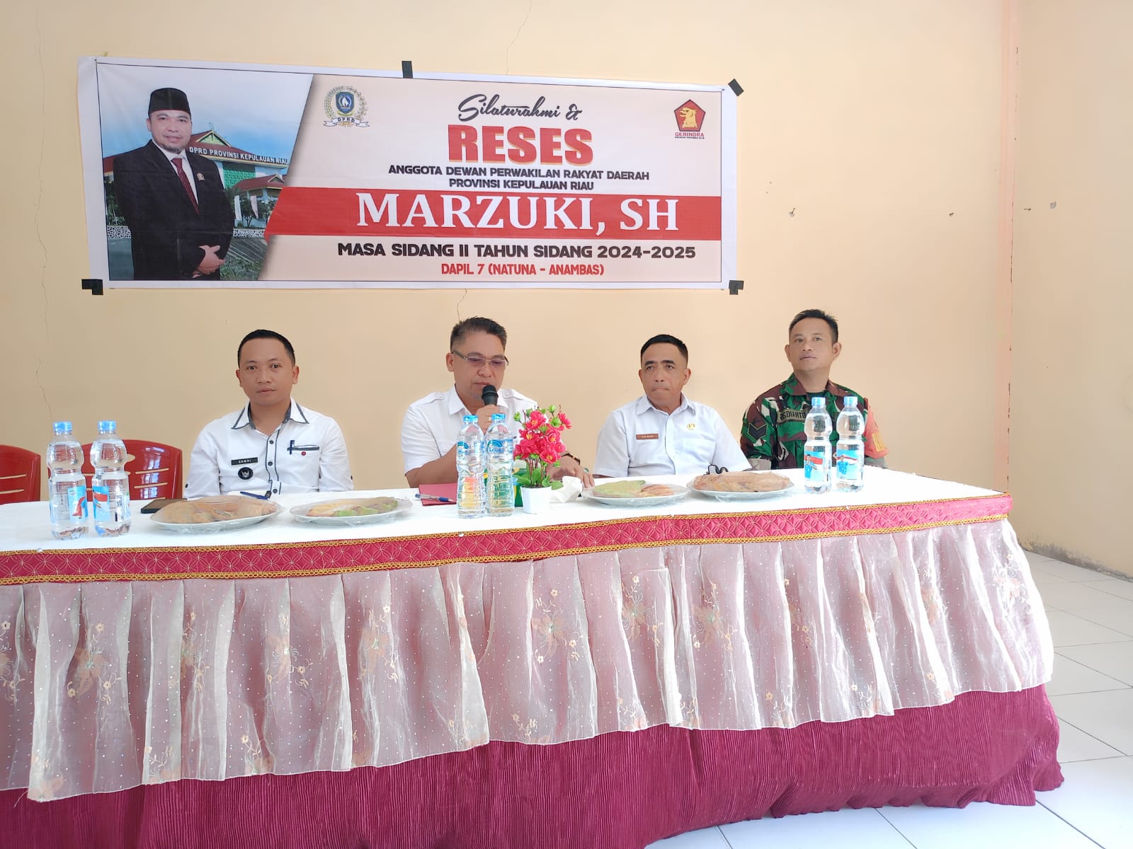 Subi|Mandhala.info– Dalam rangka menjalankan tugas konstitusional sebagai wakil rakyat, Anggota DPRD Provinsi Kepulauan Riau Dapil 7 (Natuna – Anambas), Marzuki, SH melaksanakan kegiatan reses masa sidang II tahun sidang 2024/2025 yang bertempat di Desa Meliyah, Kecamatan Subi, Kabupaten Natuna