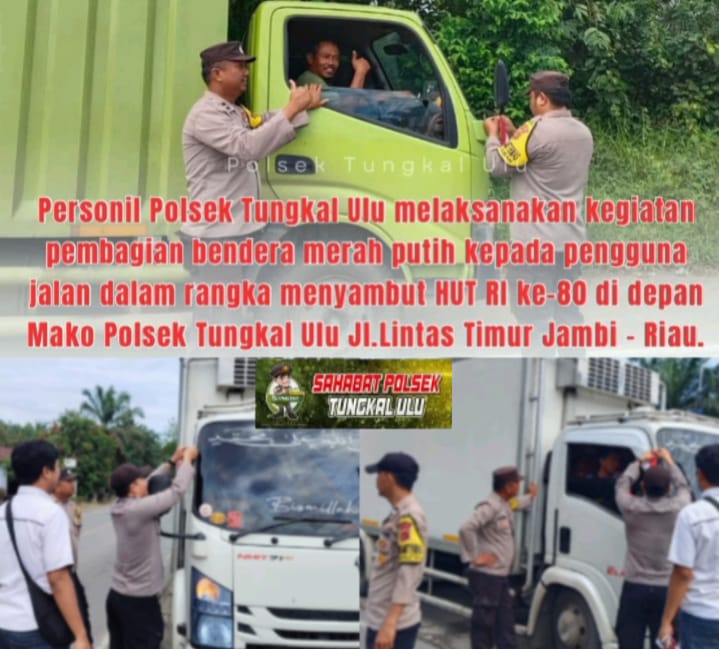 Kegiatan yang dimulai sekitar pukul 09.00 WIB ini dipimpin langsung oleh Kapolsek Tungkal Ulu, AKP Windy TK, MH, bersama seluruh personel Polsek. Sebanyak 80 bendera merah putih dibagikan kepada pengendara yang melintas di Jalan Lintas Timur Jambi – Riau.