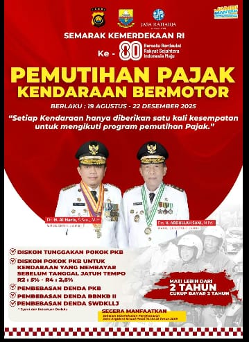 JAMBI I Mandhala.Info – Kabar gembira bagi masyarakat Jambi. Dalam rangka menyambut Hari Ulang Tahun (HUT) ke-80 Republik Indonesia, Pemerintah Provinsi (Pemprov) Jambi kembali menggulirkan program pemutihan Pajak Kendaraan Bermotor (PKB). Program ini akan berlangsung mulai 19 Agustus hingga 22 Desember 2025.