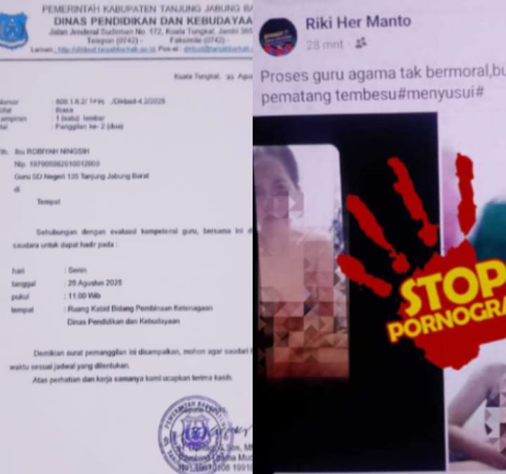 TANJAB BARAT I Mandhala.Info – Skandal video tak pantas yang diduga melibatkan oknum guru PNS bernama Rohayati Ningsih, tenaga pendidik di SD Negeri 135 Tanjab Barat, memasuki babak baru. Setelah menjadi sorotan publik, Dinas Pendidikan dan Kebudayaan Kabupaten Tanjab Barat resmi melayangkan surat pemanggilan terhadap yang bersangkutan.