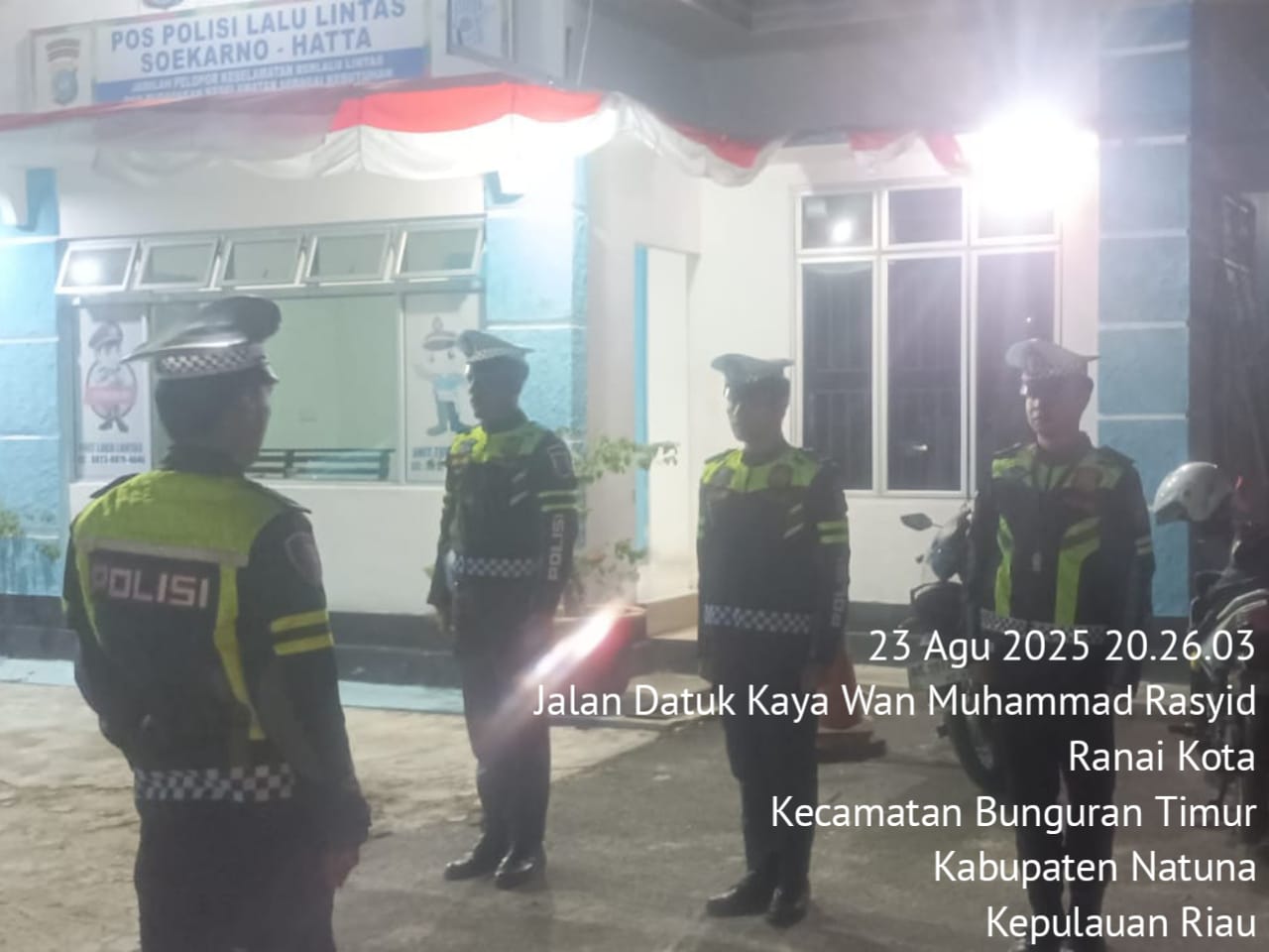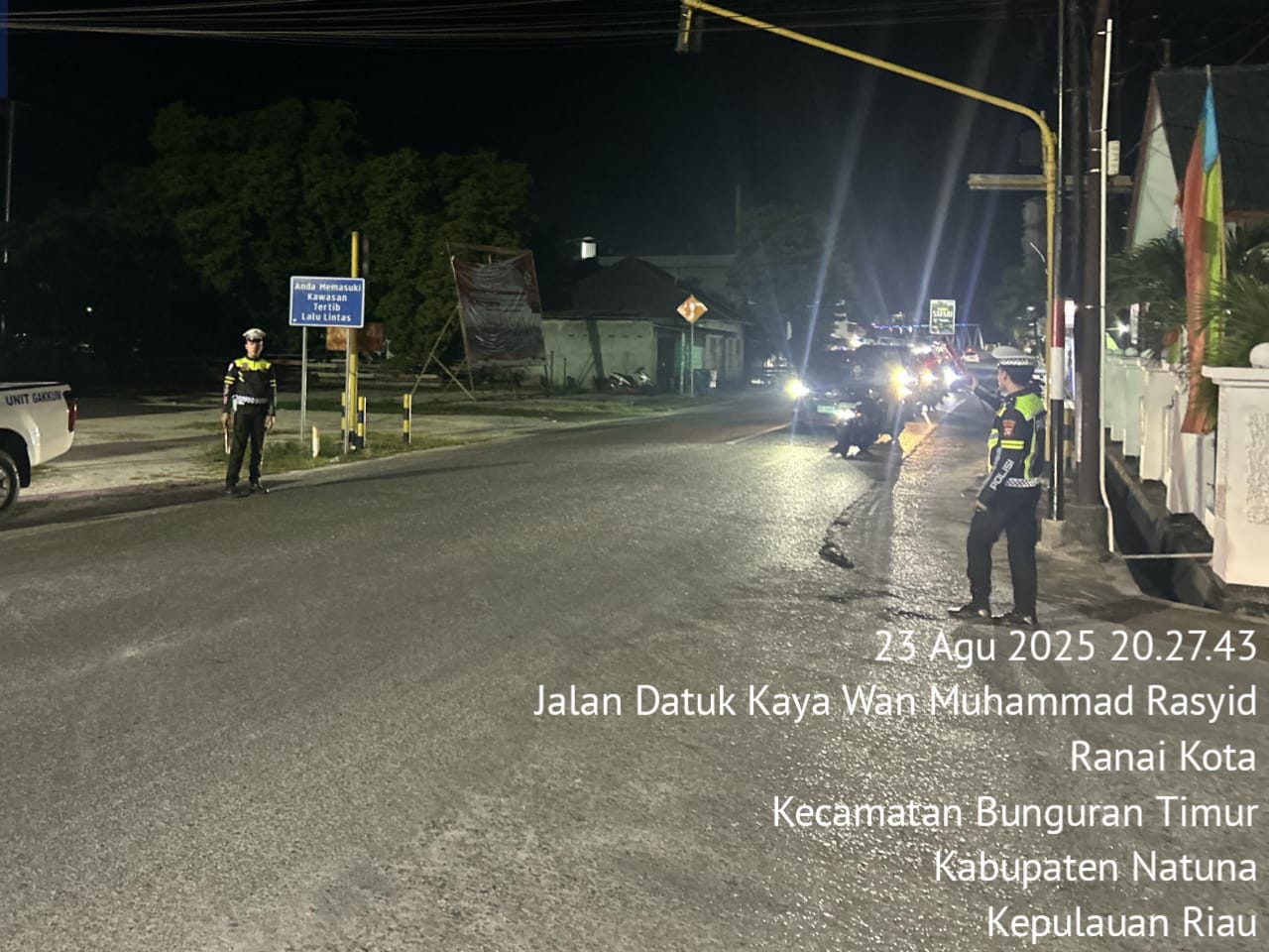 Natuna|mandhala.info – Satuan Lalu Lintas (Satlantas) Polres Natuna melaksanakan Patroli Kegiatan Rutin yang Ditingkatkan (KRYD) pada Sabtu malam (23/8) mulai pukul 20.30 Wib hingga selesai. Kegiatan ini digelar dalam rangka cipta kondisi guna mewujudkan situasi keamanan, keselamatan, ketertiban, dan kelancaran lalu lintas (Kamseltibcarlantas) serta menjaga ketertiban masyarakat di wilayah hukum Polres Natuna.