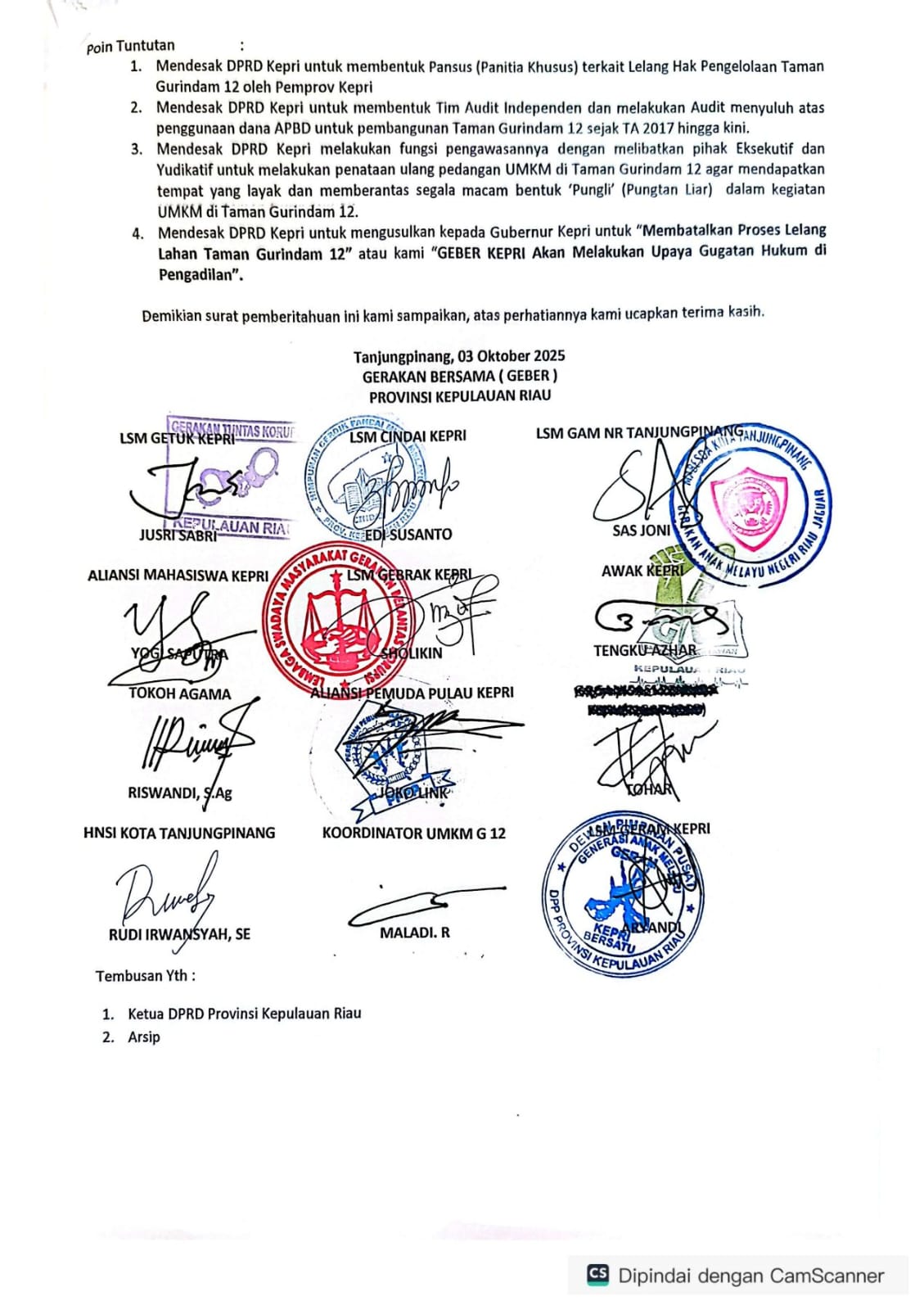 4. Mengusulkan kepada Gubernur Kepri untuk membatalkan proses lelang lahan Taman Gurindam 12, karena jika tidak, GEBER Kepri akan menempuh upaya gugatan hukum di pengadilan.