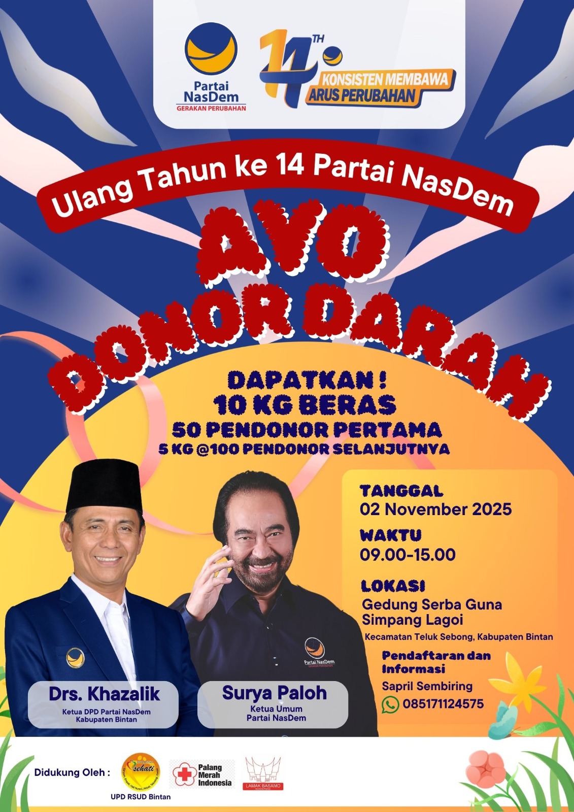 Peringatan Ulang Tahun Partai NasDem akan diawali dengan kegiatan Donor Darah yang akan dilaksanakan pada Minggu/02 November 2025, mulai pukul 09.00 hingga 15.00 WIB. Donor Darah yang bekerja sama dengan Rumah Sakit Umum Daerah, melalui Unit Pengelola Daerah (UPD) ini akan dilaksanakan di Gedung Serba Guna Simpang Lagoi, Kecamatan Teluk Sebong, Kabupaten Bintan.