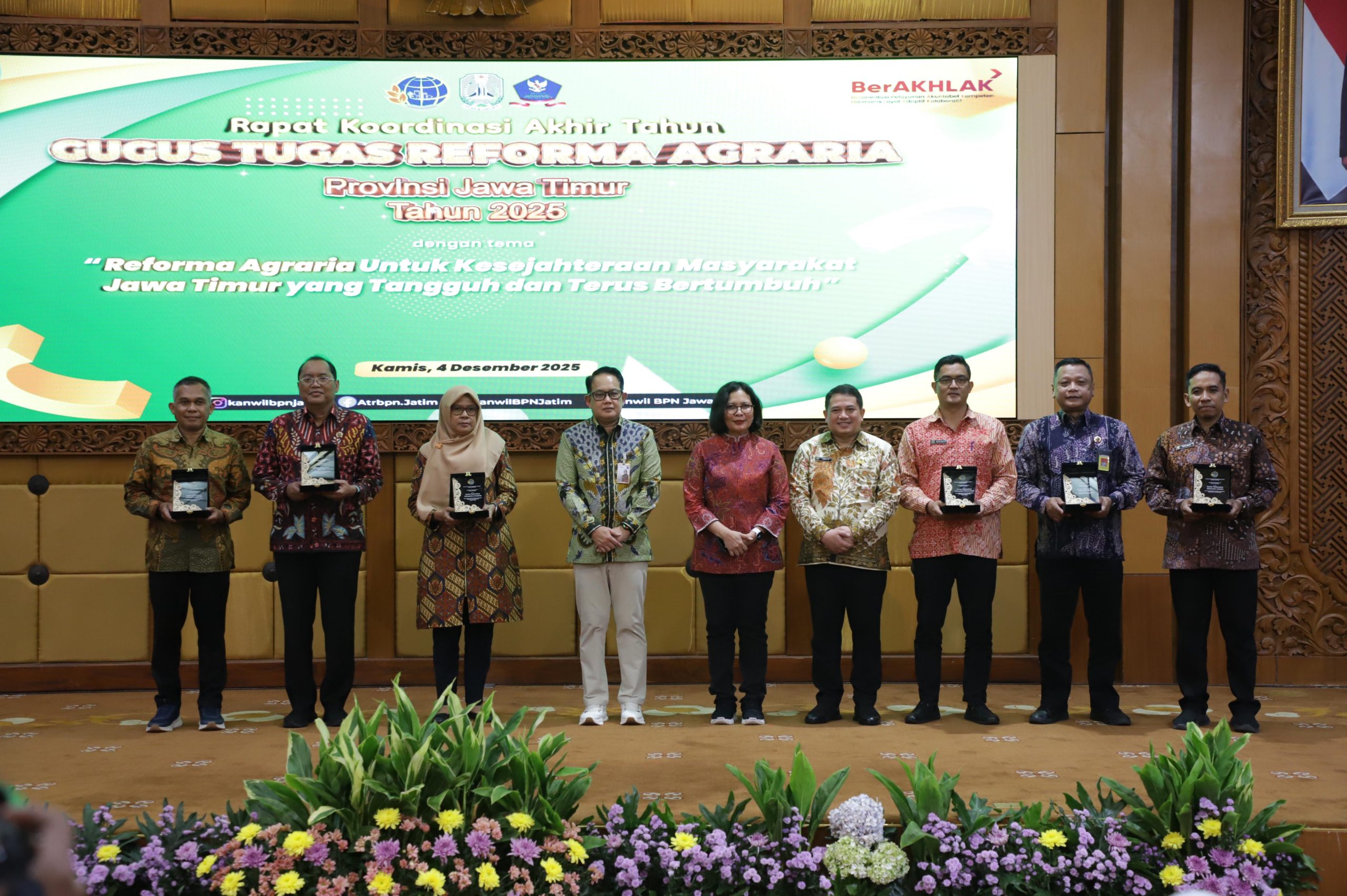 Dalam kesempatan itu, Kepala Kanwil BPN Jawa Timur sekaligus Ketua Pelaksana Harian GTRA Jatim, Dr. Asep Heri, S.H., M.H., QRMP, menegaskan bahwa rapat koordinasi ini menjadi momentum penting untuk mengkaji kembali capaian Reforma Agraria selama tahun 2025.