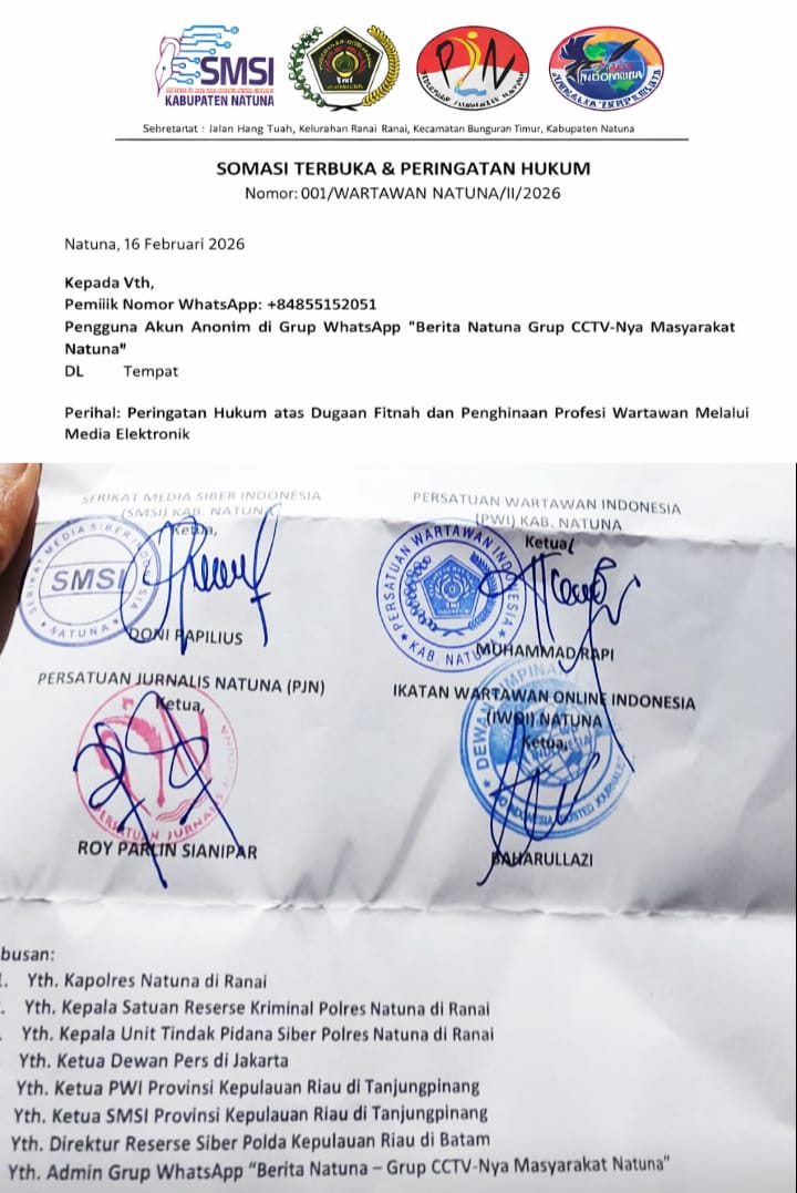 Somasi bernomor 001/WARTAWAN NATUNA/II/2026 tersebut dilayangkan pada 16 Februari 2026, menyusul beredarnya pernyataan dari akun anonim tertanggal 14 Februari 2026 yang menyebut wartawan sebagai “oknum abal-abal” serta menuding insan pers sebagai penghambat pembangunan.