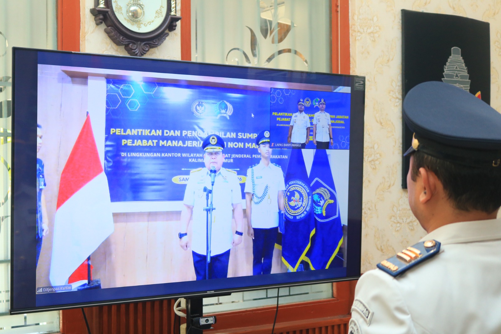 Prosesi pelantikan dan pengambilan sumpah jabatan dipimpin langsung oleh Kepala Kantor Wilayah (Kakanwil) Ditjenpas Kalimantan Timur, Endang Lintang Hardiman, pada Sabtu (11/4). Meski dilakukan secara virtual dari Ruang Kalapas Banyuwangi, momen sakral tersebut berlangsung dengan penuh khidmat.